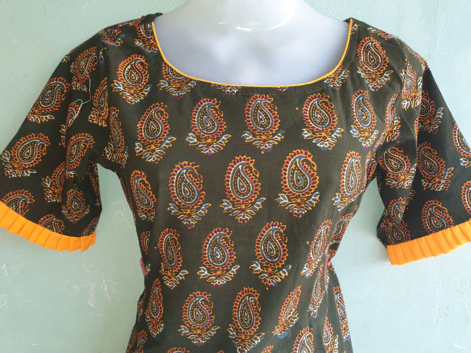 Bottle Green Cotton Straight Printed Kurti with Bottle Neck.
