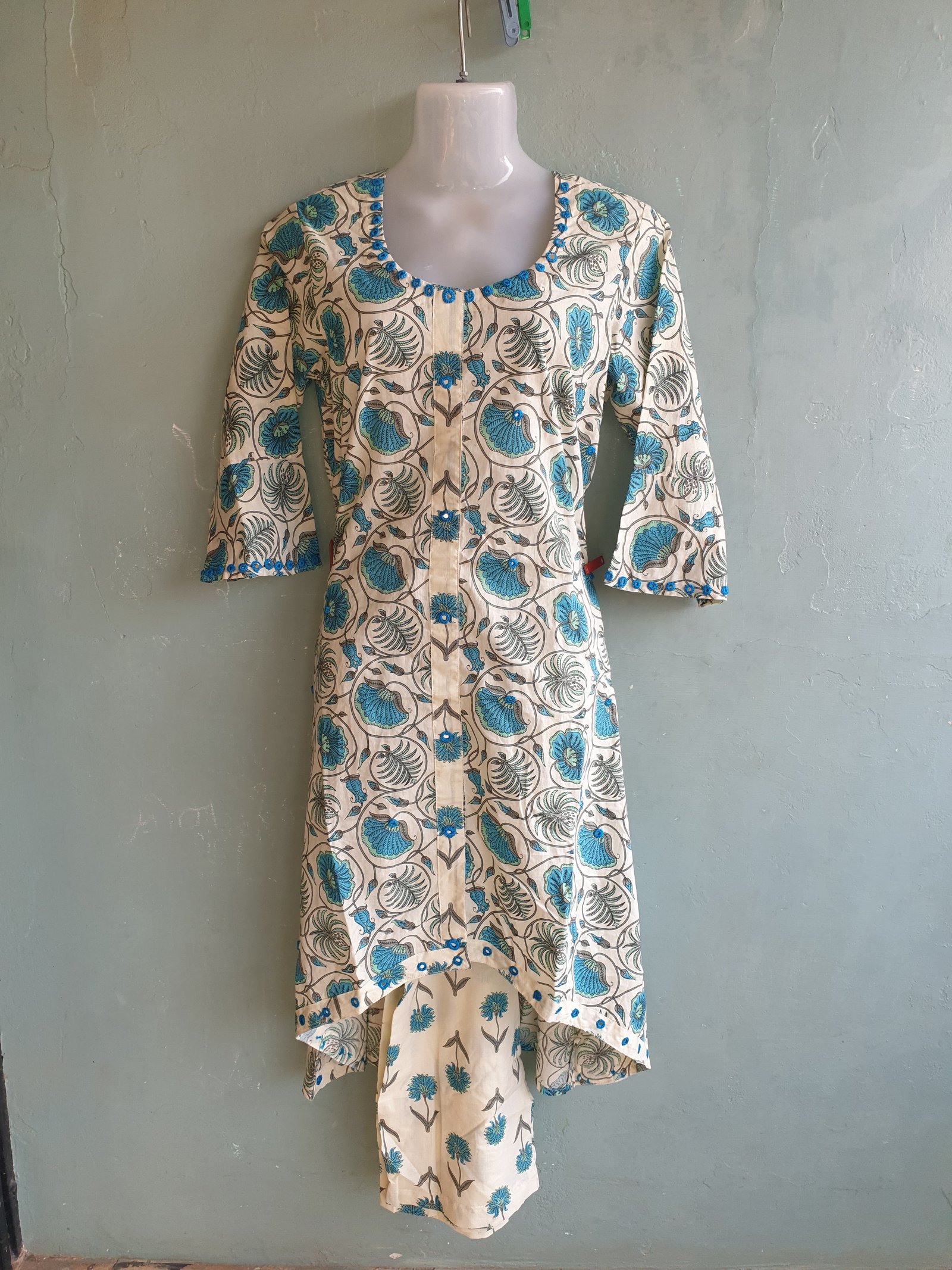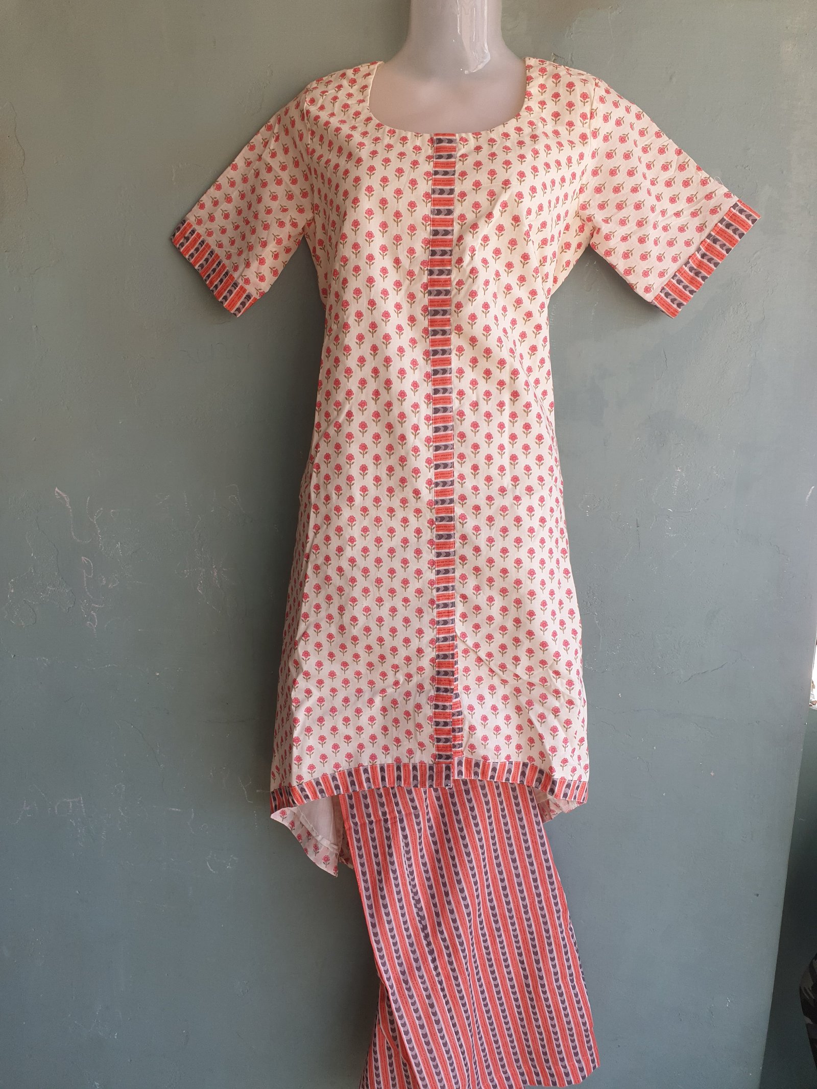 Small Flower Print Cotton Kurti Pant Set with Up and Down Pattern